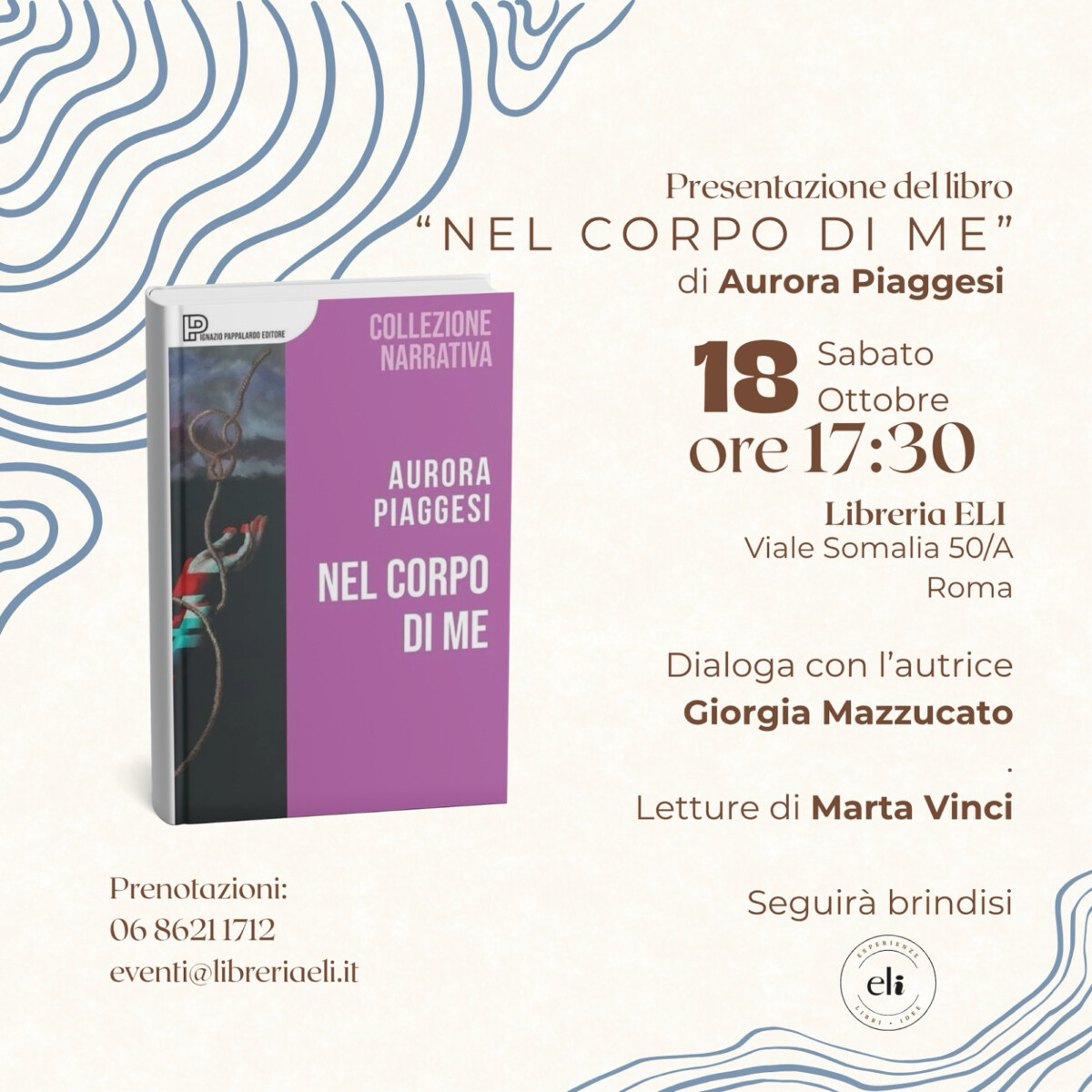 Roma. Sabato 18 ottobre alle ore 17,30 la libreria ELI in viale Somalia 50/A a Roma, ospiterà la presentazione del libro NEL CORPO DI ME di Aurora Piaggesi. Un racconto che unisce realismo e visione, corpo e metafora, per interrogarsi su cosa significhi davvero “dare la vita” e su quanto siamo disposti a comprendere ciò che sfugge alla logica.